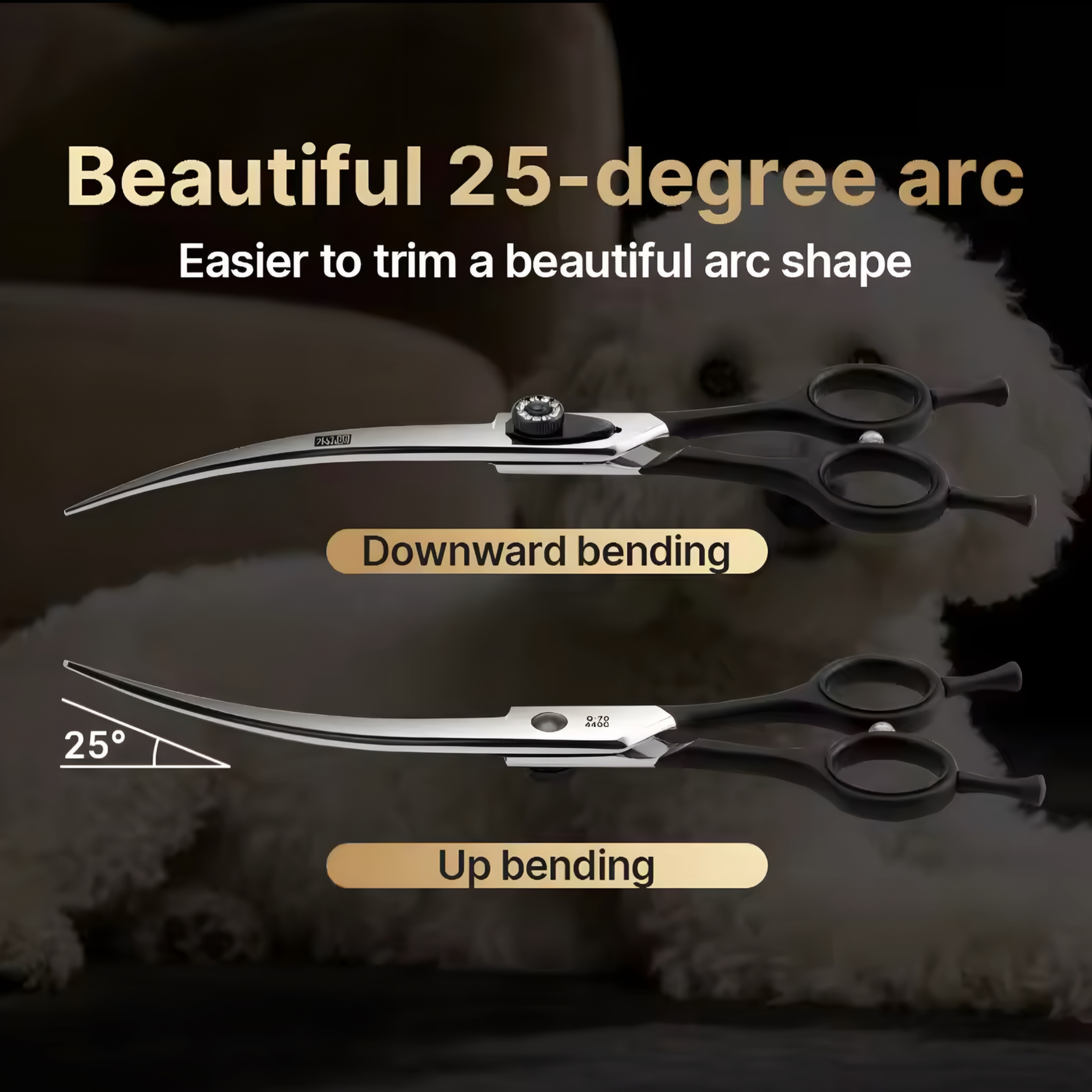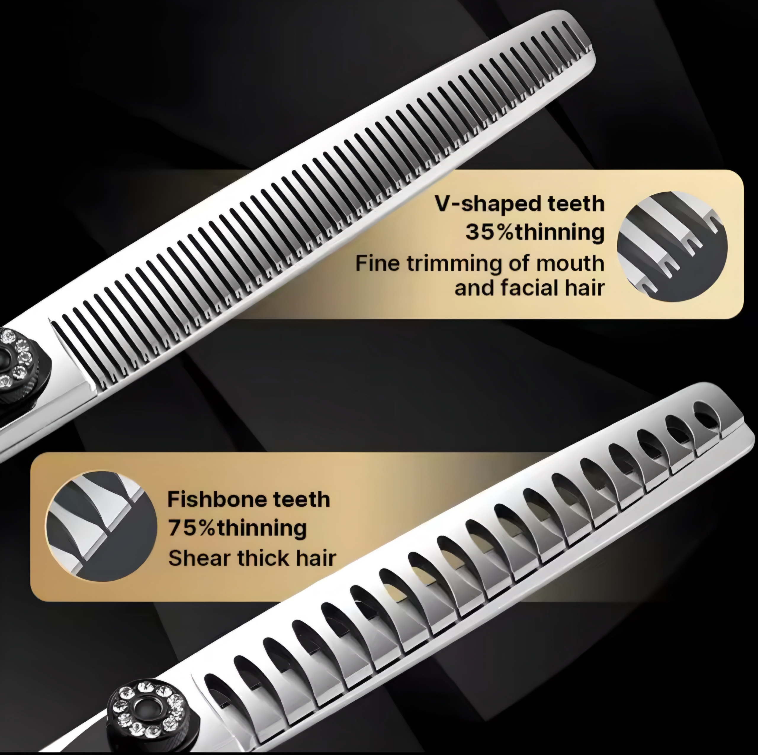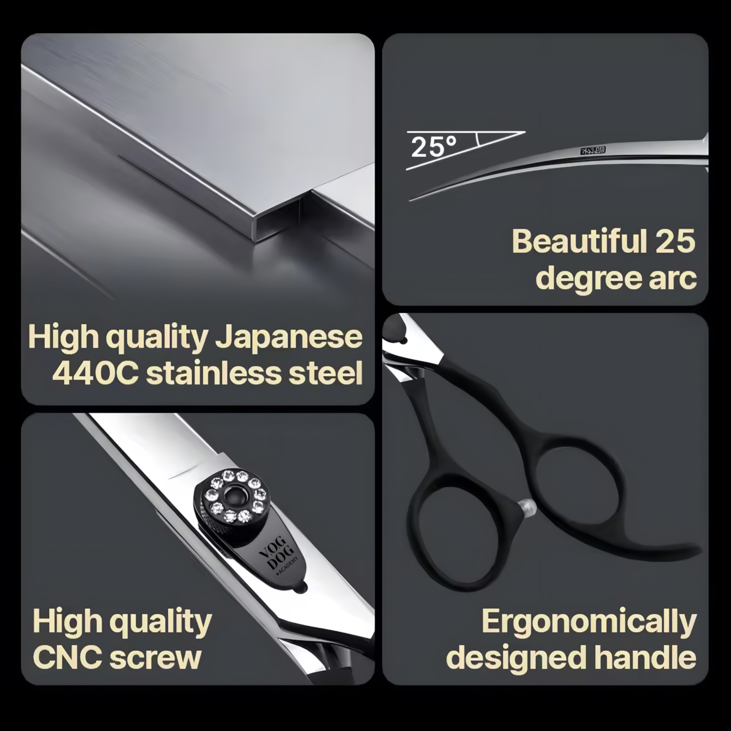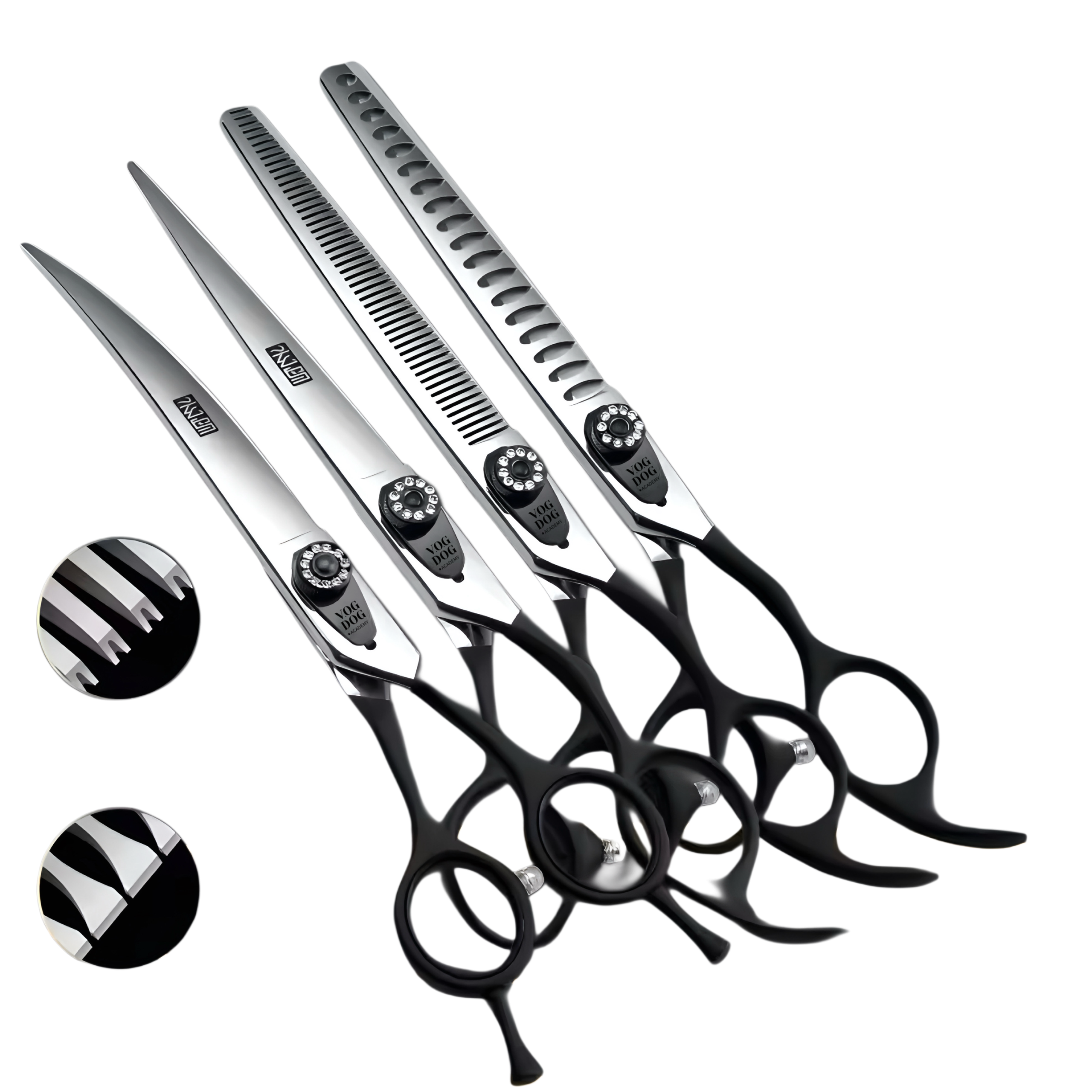 Набір розроблений для професійного догляду за тваринами та дозволяє впевнено працювати з різними типами шерсті — від щільної та жорсткої до м’якого підшерстка. Прямі ножиці формують базову лінію, вигнуті створюють природні округлості, філірувальні забезпечують делікатне прорідження, а шанкерні — м’яке текстурування та плавні переходи без різких слідів зрізу. Інструменти однаково ефективні як для швидкої корекції, так і для точної деталізації.