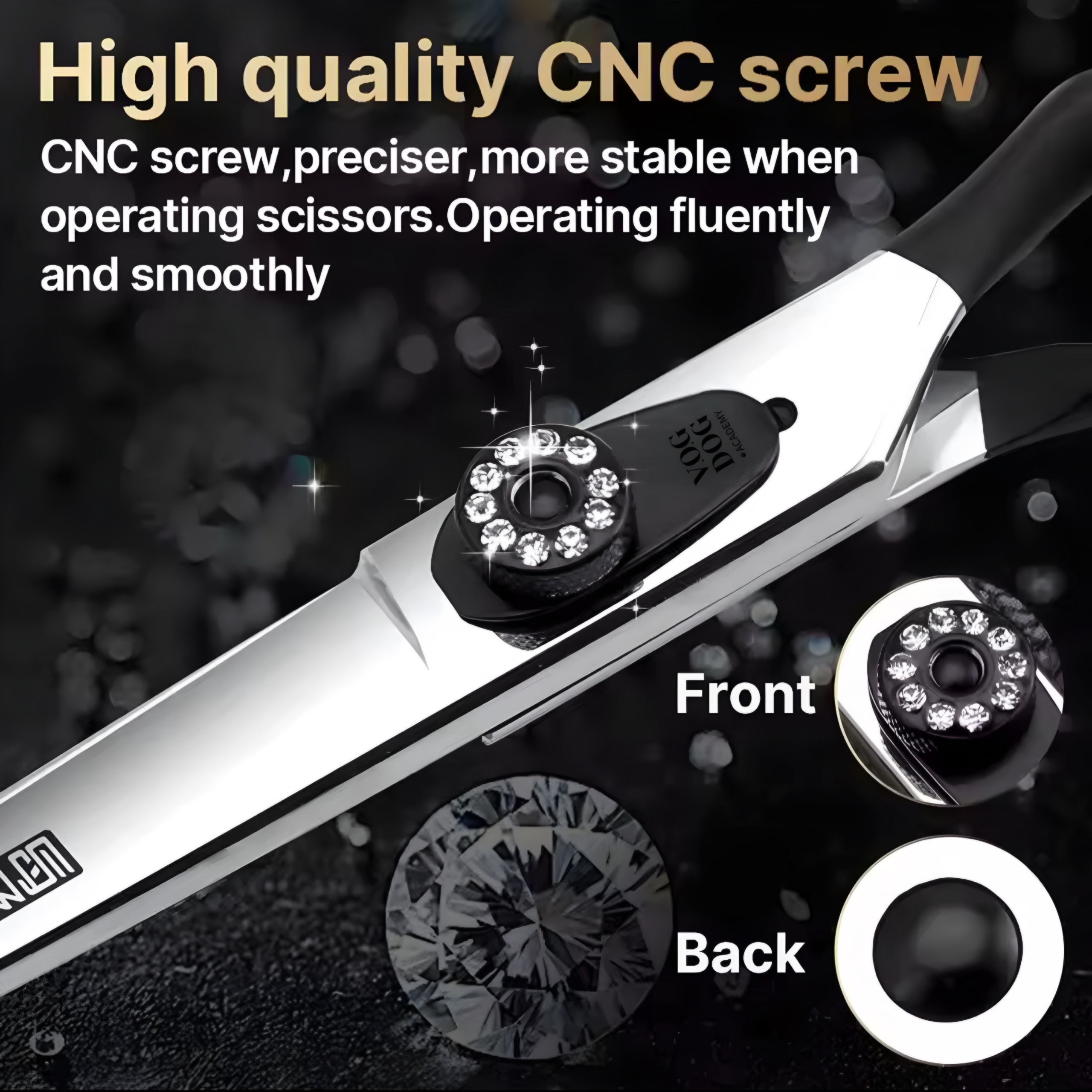 Професійний набір ножиць V.D. Family 7.5 дюймів для грумінгу тварин з чорними кільцями та преміальним регулятором натягу з кристалічним оздобленням